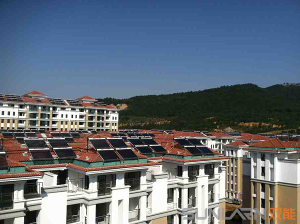近兩年,隨著技術(shù)的日益成熟,一種新的太陽能熱水系統(tǒng)模式——集中集熱、分戶供熱系統(tǒng)正逐漸受到越來越多熱水需求方的青睞。浙江湖州楊家埠•民和花園熱水系統(tǒng)項(xiàng)目,由江蘇雙能太陽能有限公司設(shè)計、施工,采用的即是集中集熱、分戶供熱系統(tǒng)。