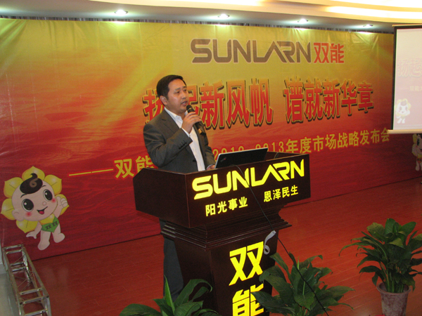 董事長首先為大會致辭,對遠道而來的經銷商朋友表示熱烈的歡迎及衷心地感謝。董事長表示愿以雙能品牌的大發展為紅線,凝聚各地雙能經銷商的共同智慧、共創雙能品牌的美好明天,與經銷商朋友共同抒寫“陽光事業,恩澤民生”的壯麗篇章。并表示,這次會議將是雙能歷史上頗具紀念意義的一次會議,是雙能實現二次創業的轉折點。