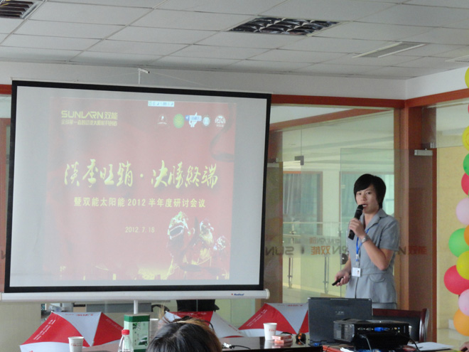 2012718,雙能公司在海安舉行了淡季旺銷•決勝終端暨雙能太陽能2012半年度研討會。雙能公司總經理吉德康、營銷總監王慧以及海安的全體經銷商參加了會議。