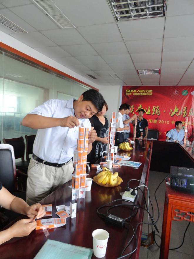 會議正式開始前,雙能工作人員與經銷商朋友做了撲克疊牌節節高的暖場游戲。游戲過程中一派其樂融融的景象,通過節節高的游戲,拉近了經銷商與雙能公司的距離,增進了彼此之間的感情,“節節高”也預示著雙能經銷商朋友的生意節節高升,雙能公司的發展節節高升。