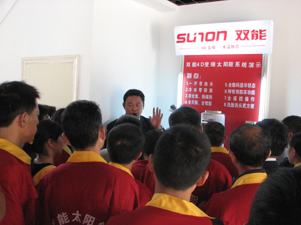 最后參觀的是最讓大家期待的雙能新產品4D變頻太陽能,為了讓大家全面了解新產品的技術特征、功能原理,雙能總經理賁道發親自上陣,在公司展廳為大家介紹了4D變頻太陽能并現場進行演示。一位經銷商表示,四川因為雨霧天氣較多,有了雙能4D變頻太陽能熱水器,困擾了好多年的問題終于有辦法解決了。此外,不少經銷商還在現場就預訂了多臺4D變頻太陽能熱水器。
