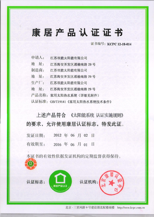 11月5日,雙能太陽能收到了由北京康居認證中心寄來的康居產(chǎn)品認證新證書。這表明雙能太陽能在獲得康居產(chǎn)品認證證書的時期內(nèi),保持著高效、節(jié)能的產(chǎn)品特點。雙能全玻璃真空管緊湊式太陽能、全玻璃真空管分體式太陽能及平板分體式太陽能均通過定期監(jiān)督。