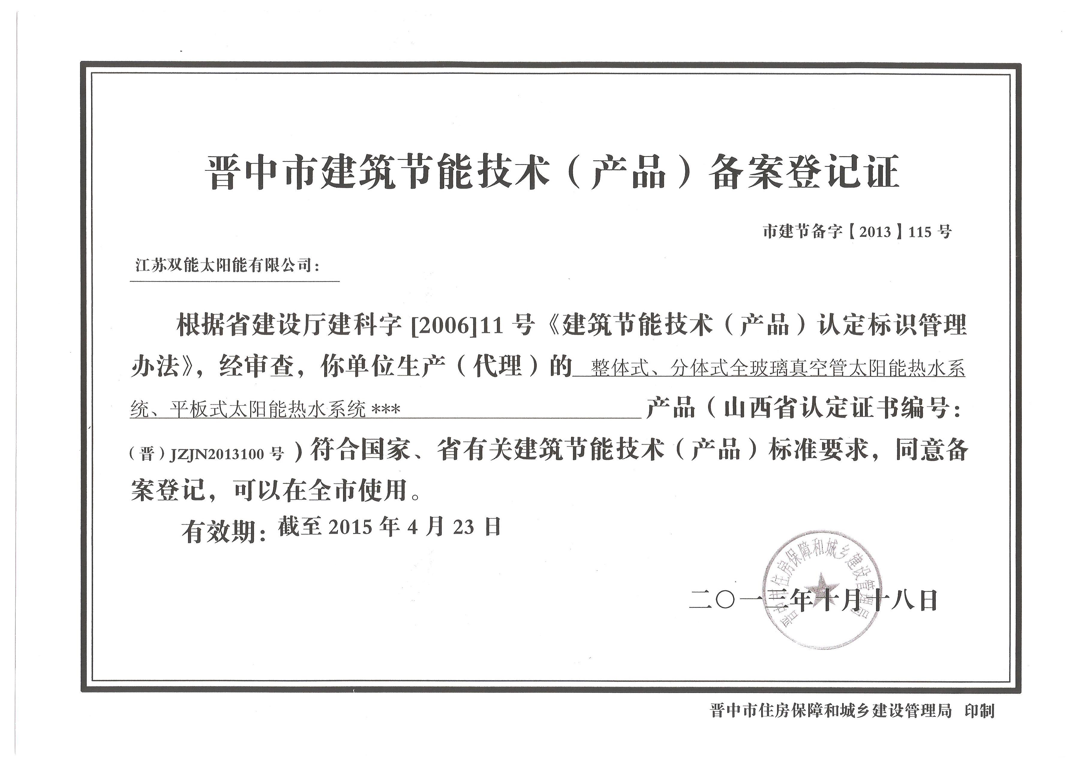 日前,江蘇雙能太陽能有限公司獲得由晉中市住房保障和城鄉建設管理局頒發的“晉中市建筑節能技術(產品)備案登記證”,雙能整體式、分體式全玻璃真空管太陽能熱水系統、平板式太陽能熱水系統均被納入晉中市建筑節能技術產品推廣范圍。